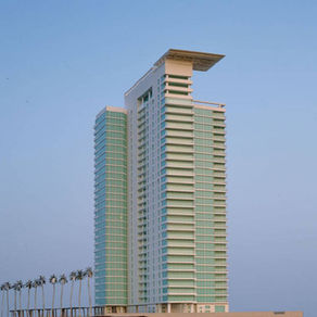One 30-story tower and 45-story tower are placed on the ends of the site and angled in shape to minimize blockage of ocean views from buildings north of the development. The north sides of the towers are parallel with the existing urban grid in order to integrate the project with the rest of downtown. The south sides face the ocean with unimpeded views of Catalina Island in the distance, as well as the nearby harbor and the beautiful beach from which the city takes its name. The 550 units were all designed with balconies, large, tinted-glass windows and elegant interior spaces. Some are two stories and the corner units have a 270 degree view of the coast and city.