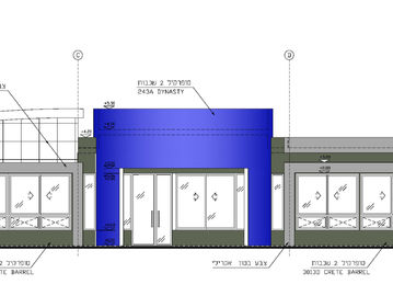 The kindergarten in Bnei Ayish features a modern design with a curved roof that provides shade. The facade is painted in warm colors, and the entrance area is highlighted by a red wall. Outside, there is a playground with various play structures, all protected from the sun by colorful canopies. The play area is fenced for safety, and benches are available for seating.