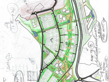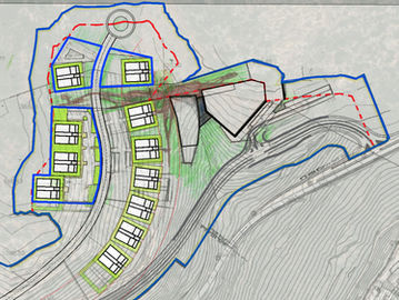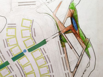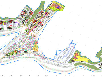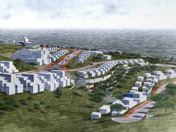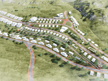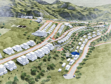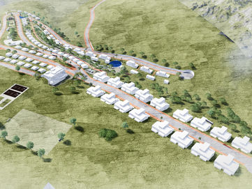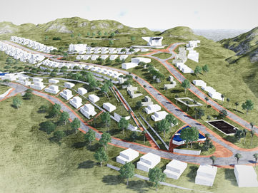 This conceptual project on complex terrain includes multi-family residential buildings and individual housing. The new layout of streets and roads ensures convenient mobility for residents and harmonious integration with the surrounding environment. Buildings are situated along winding roads that seamlessly blend into the natural landscape.